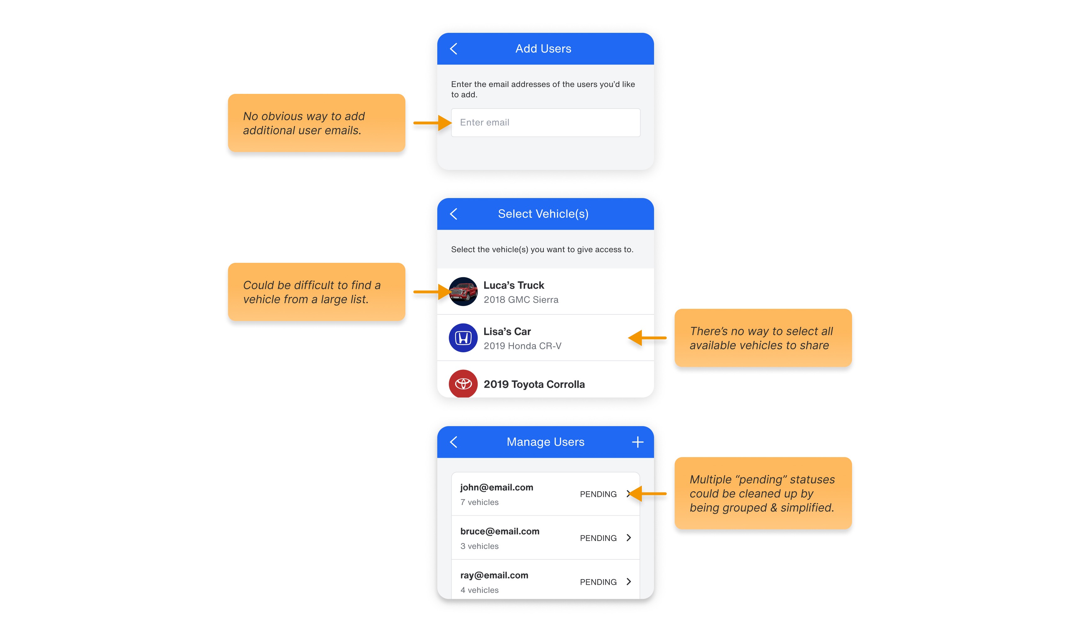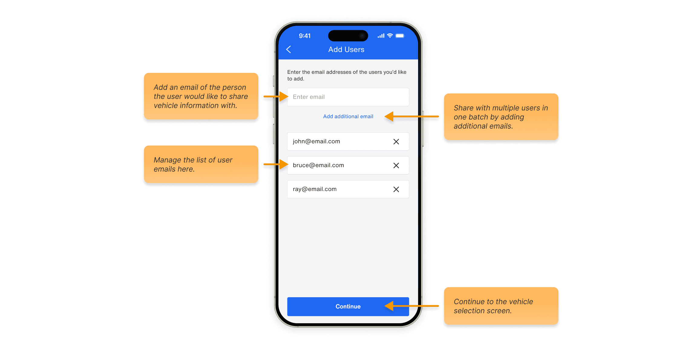 We needed to make a smooth path to sharing vehicle information with multiple users. When users enter the sharing flow, the first screen lets them invite multiple people in one batch.