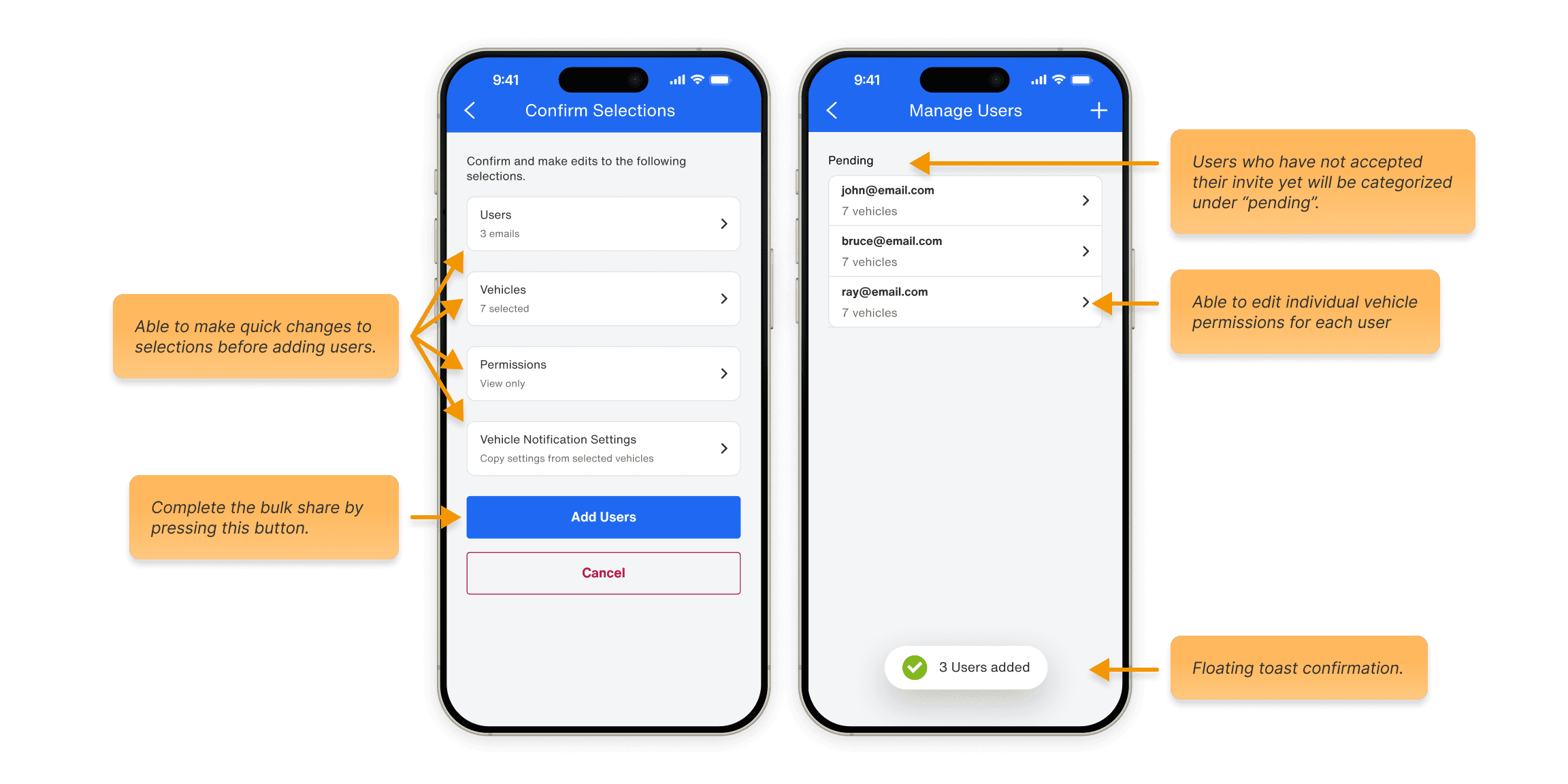 After completing the steps, users see a confirmation screen where they can adjust their selections. Upon pressing "Add Users", they are then taken to the "Manage Users" screen where they can view added users and update individual permissions if needed.